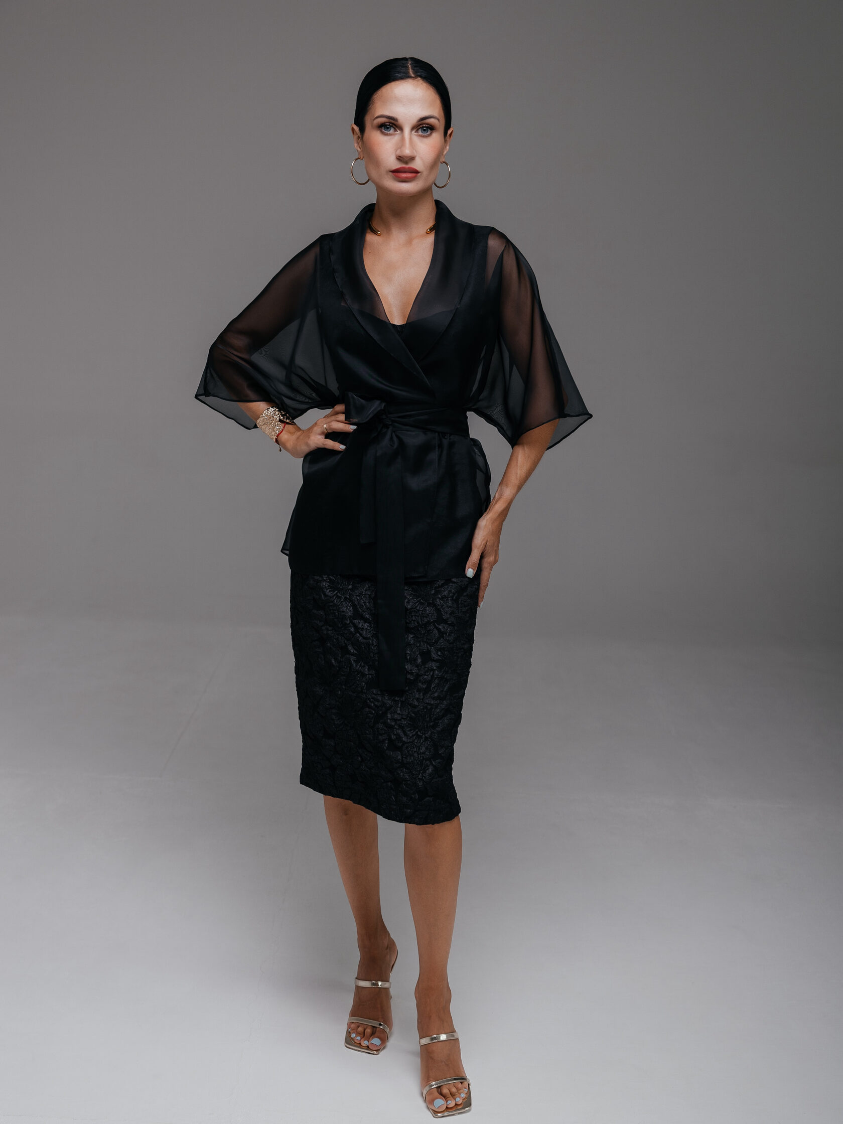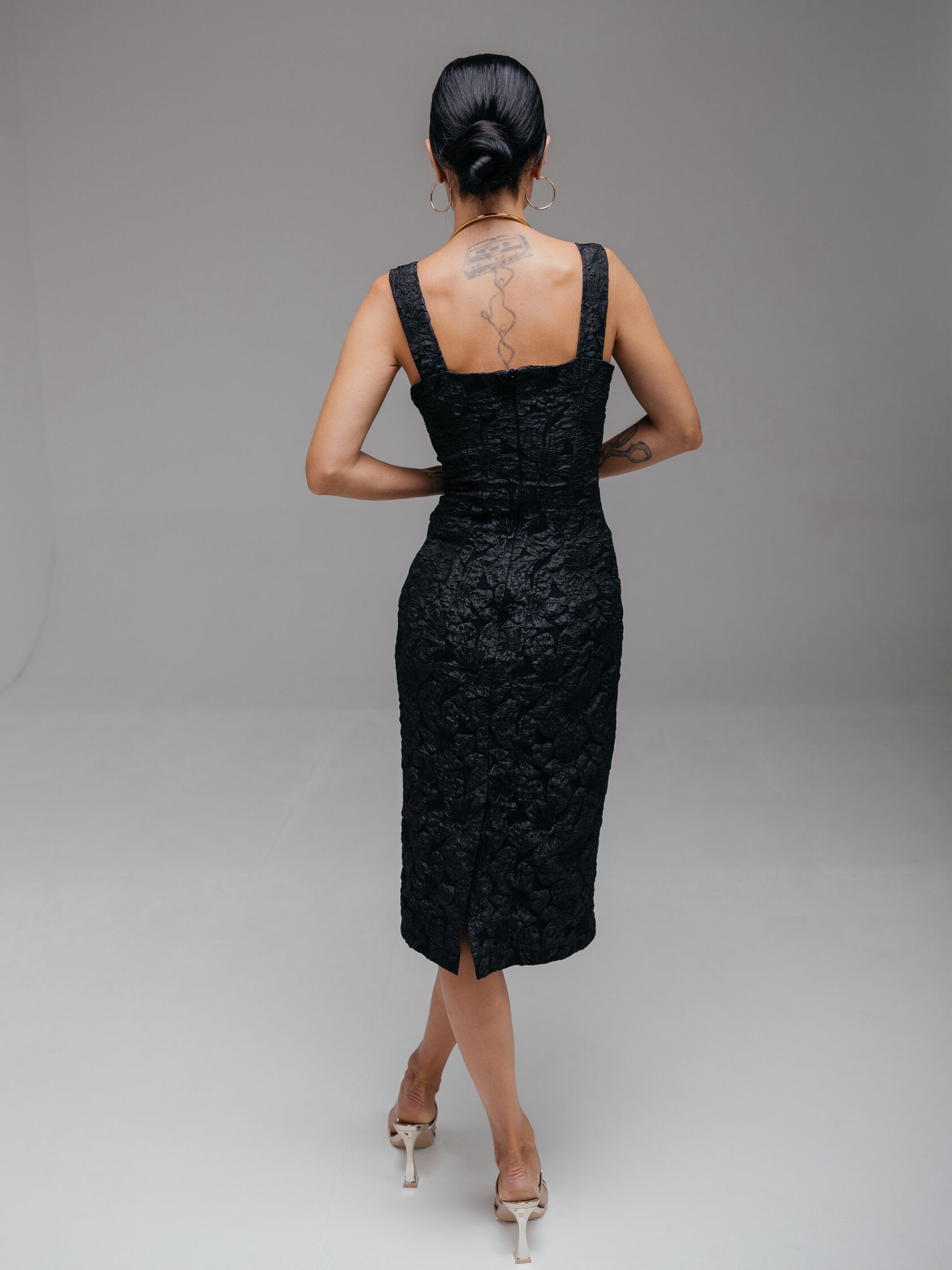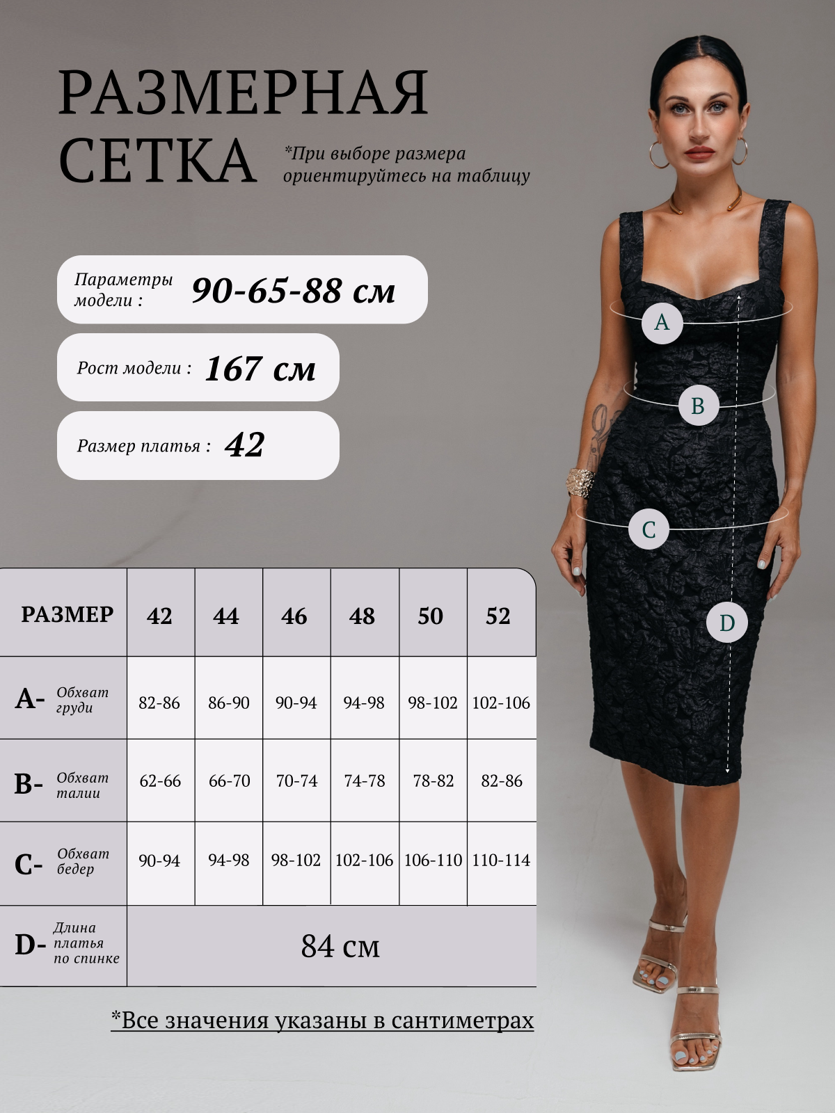 Элегантное коктейльное платье футляр на лямках идеально подчеркнет фигуру и станет базовым элементом вашего гардероба. Модель выполнена из жаккардовой ткани с добавлением вискозы в составе, что обеспечивает приятные ощущения при носке и создает стильный внешний вид. Приталенный крой выгодно облегает формы, акцентируя внимание на достоинствах женской фигуры. Длина миди по колено подходит для невысоких и высоких девушек, делает образ универсальным для любого случая — день рождения, юбилей, корпоратив или свадьба. Образ легко дополнить аксессуарами для создания нарядного праздничного или офисного стиля. Глубокий вырез декольте и открытая спина добавляют изделию молодежную нотку и подчеркивают современность дизайна. Молния аккуратно расположена сзади, что упрощает процесс надевания. Черный цвет визуально стройнит и придает платью особую элегантность, делая его отличным выбором как для повседневной носки, так и для вечерних выходов. Сделано в России