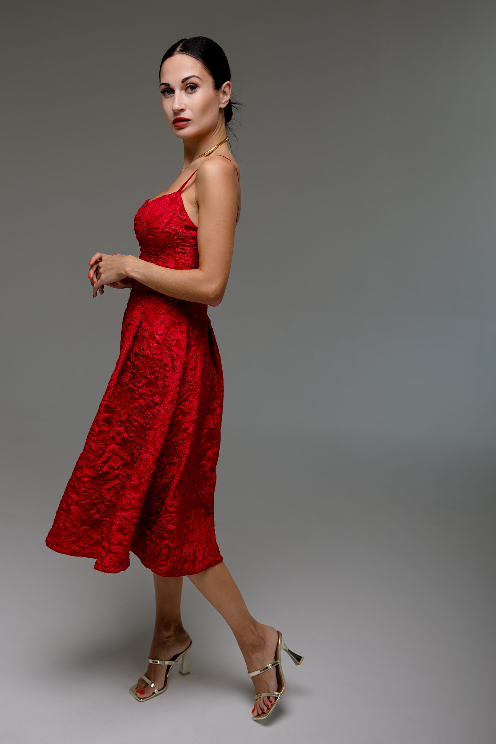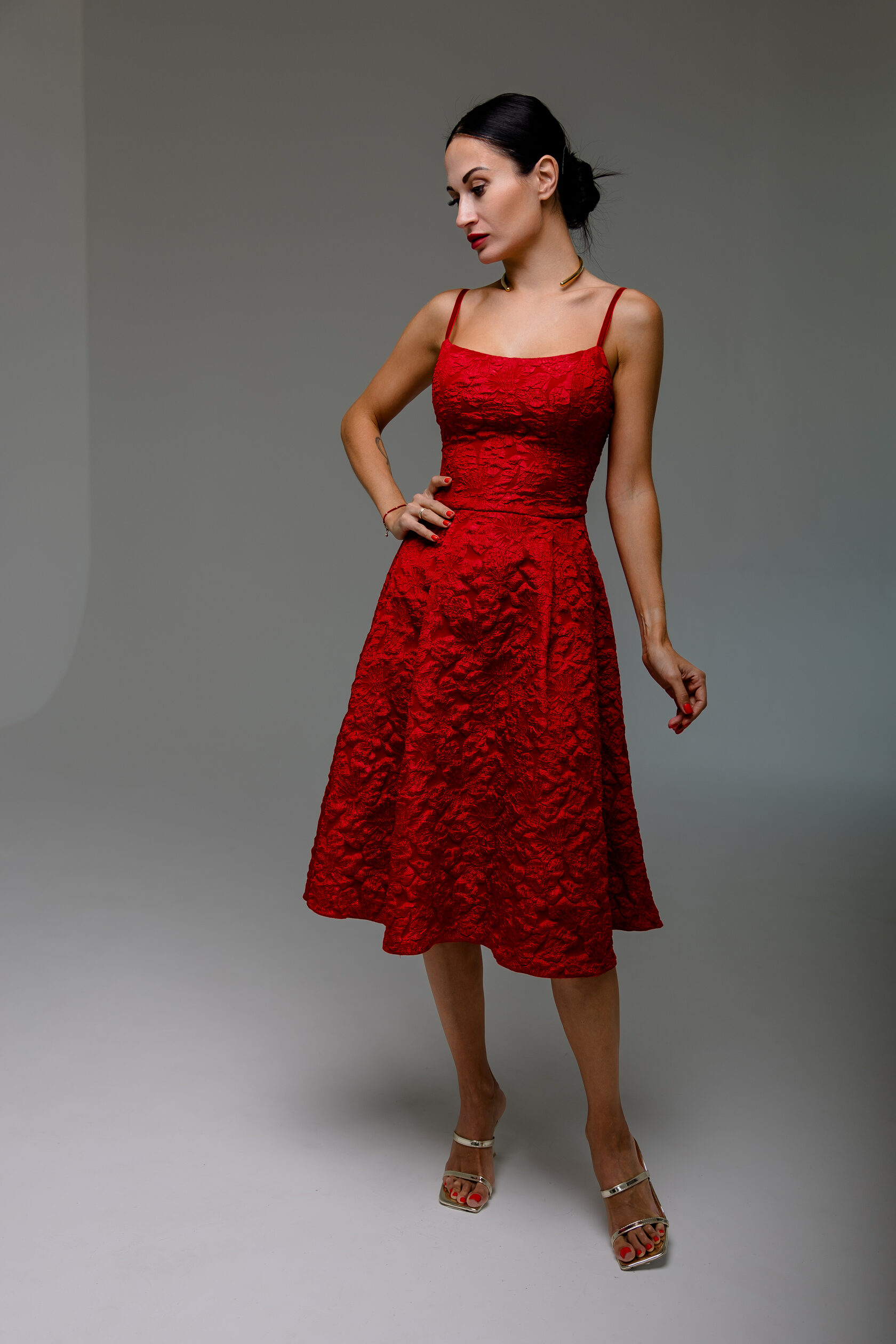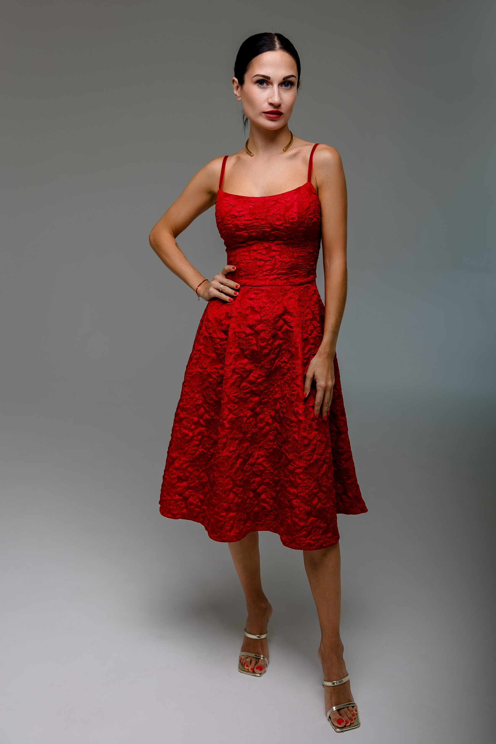 Коктейльное платье изготовлено из легкого материала с вискозой в составе, изделие идеально подходит для летнего сезона. Уникальная текстура и рельефный узор придают платью неповторимый шарм и элегантность. Бордовый цвет придает нарядному сарафану элегантность, делая его универсальным решением для различных случаев — от выпускного до вечерних выходов.Бретелькидобавляют нотку утонченности и делают модель еще более привлекательной. Такое праздничное решение легко сочетать с различными аксессуарами, что позволяет создать уникальный образ в зависимости от настроения. Носите его с каблуками или балетками — в любом случае вы будете выглядеть стильно и современно. Это платье обязательно привлечет восторженные взгляды и станет незаменимым элементом вашего гардероба на лето. Модель выполнена с открытыми плечами и регулируемыми бретелями, что обеспечивает идеальную посадку и комфорт. Оригинальный вырез придаёт изделию изысканности, а молния на спине добавляет практичности. Этот наряд деликатно облегает силуэт, акцентируя внимание на талии и создавая женственный и грациозный образ. С подкладкой, оно не просвечивает, что обеспечивает дополнительный комфорт во время длительных праздников. Подходит на свадьбу или выпускной, а также для подружек невесты и в день рождения. Будьте неотразимы на празднике с этим стильным и праздничным нарядом!