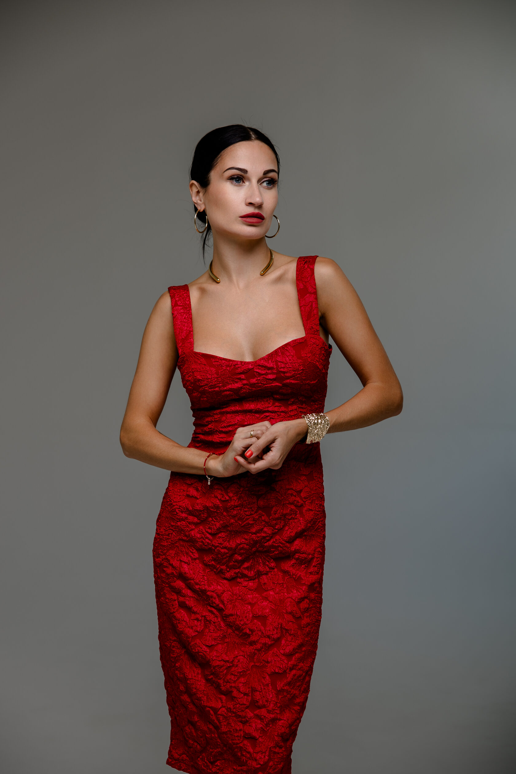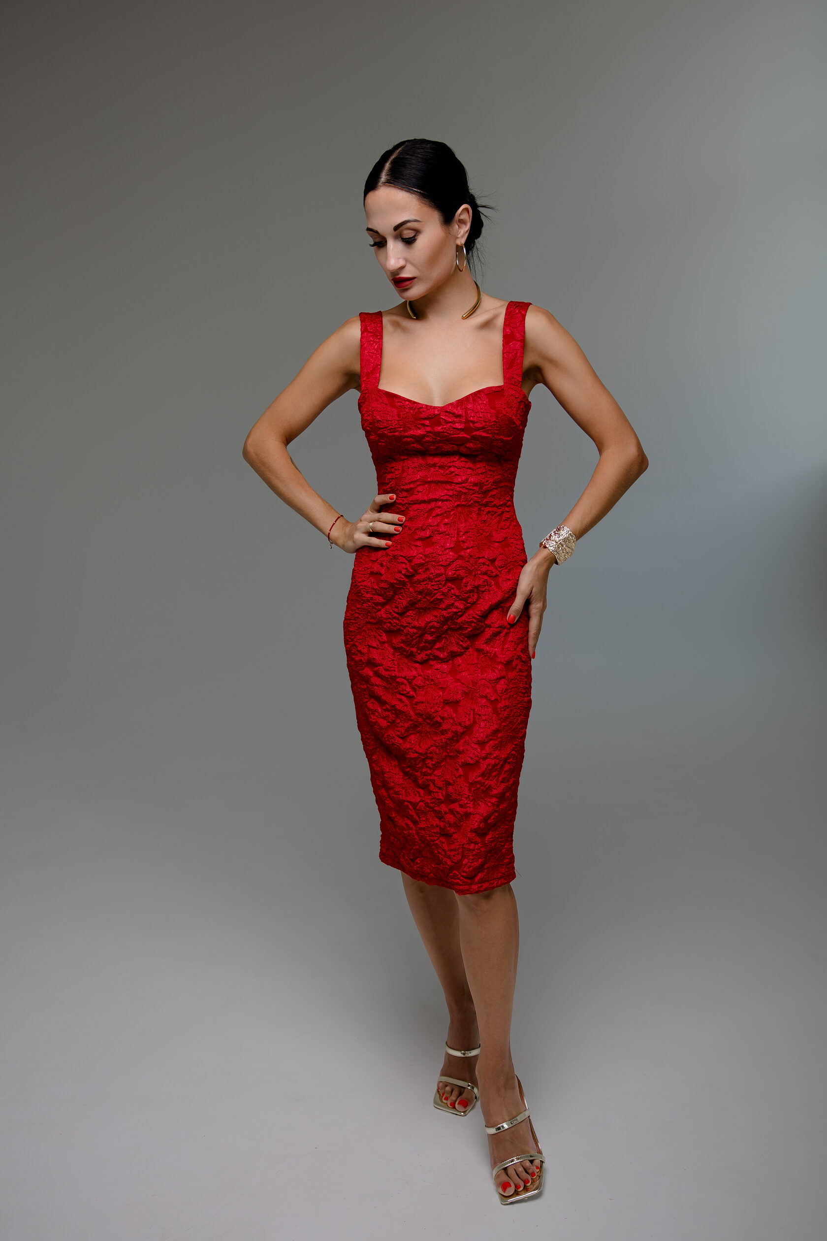 Элегантное коктейльное платье футляр на лямках идеально подчеркнет фигуру и станет базовым элементом вашего гардероба. Модель выполнена из жаккардовой ткани с добавлением вискозы в составе, что обеспечивает приятные ощущения при носке и создает стильный внешний вид. Приталенный крой выгодно облегает формы, акцентируя внимание на достоинствах женской фигуры. Длина миди по колено подходит для невысоких и высоких девушек, делает образ универсальным для любого случая — день рождения, юбилей, корпоратив или свадьба. Образ легко дополнить аксессуарами для создания нарядного праздничного или офисного стиля. Глубокий вырез декольте и открытая спина добавляют изделию молодежную нотку и подчеркивают современность дизайна. Молния аккуратно расположена сзади, что упрощает процесс надевания. Бордовый цвет визуально стройнит и придает платью особую элегантность, делая его отличным выбором как для повседневной носки, так и для вечерних выходов. Сделано в России